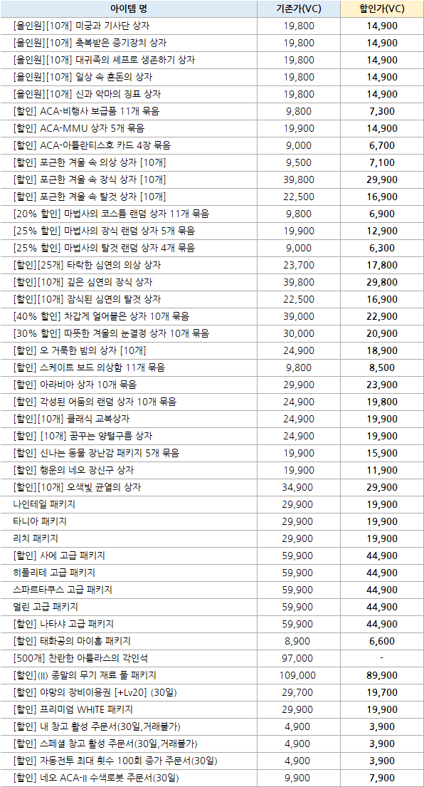 - 내용: 해당 기간 동안 다음 아이템이 기간 한정으로 할인 또는 재판매됩니다.