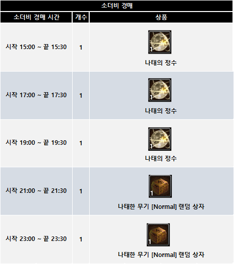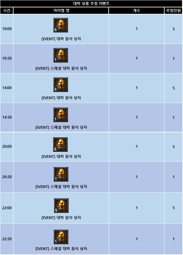 - 내용: 해당 시간에 접속중인 캐릭터 중 추첨을 통해 대박 상품을 지급