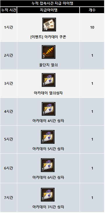 - 내용: 기간 동안 누적 접속 시간에 따라 아래의 보상 아이템을 지급