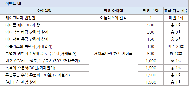 - 누적 접속과 케이크나라 던전 몬스터 사냥을 통해 획득하신 [케이크나라 한정 케이크]를 모아