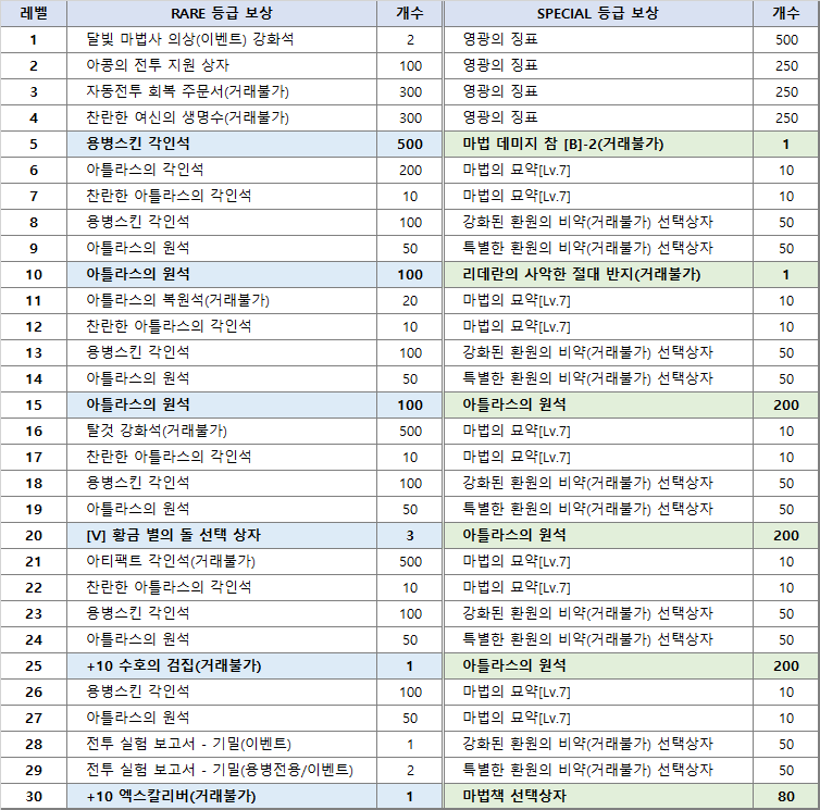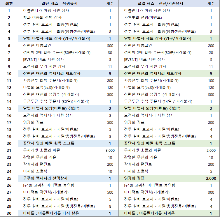 ※ Rare / Special 등급 보상은 [로열 패스]와 [리턴 패스] 모두 동일합니다.